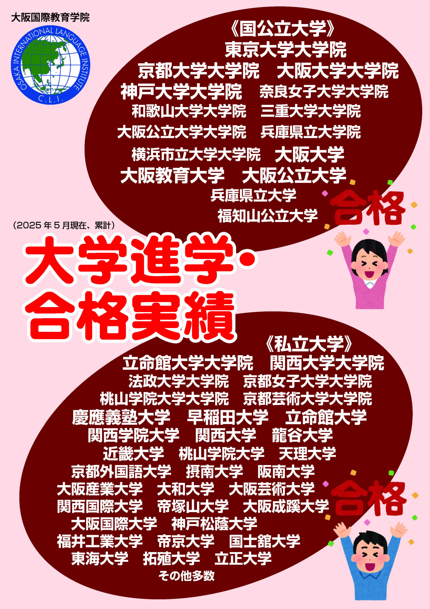 Osaka University graduate school, Kobe University graduate school, Osaka City University graduate school, Keio University, Ritsumeikan University, Kansai University and more prestigious public and private universities and graduate schools.
