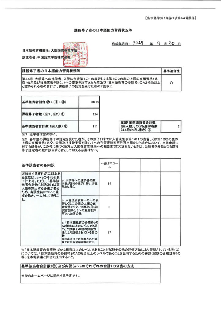 課程修了者の日本語能力習得状況等(作成年月日:2025年6月3日)
